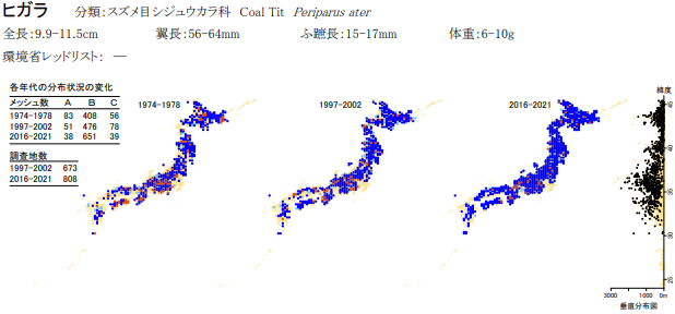 1974-1978年と1997-2002年に行なわれた調査により,日本の鳥の変化が見えてきています。そして,減少している鳥がレッドリストに指定されたりして保護が進められています。これらの情報は,以下に公開されています。