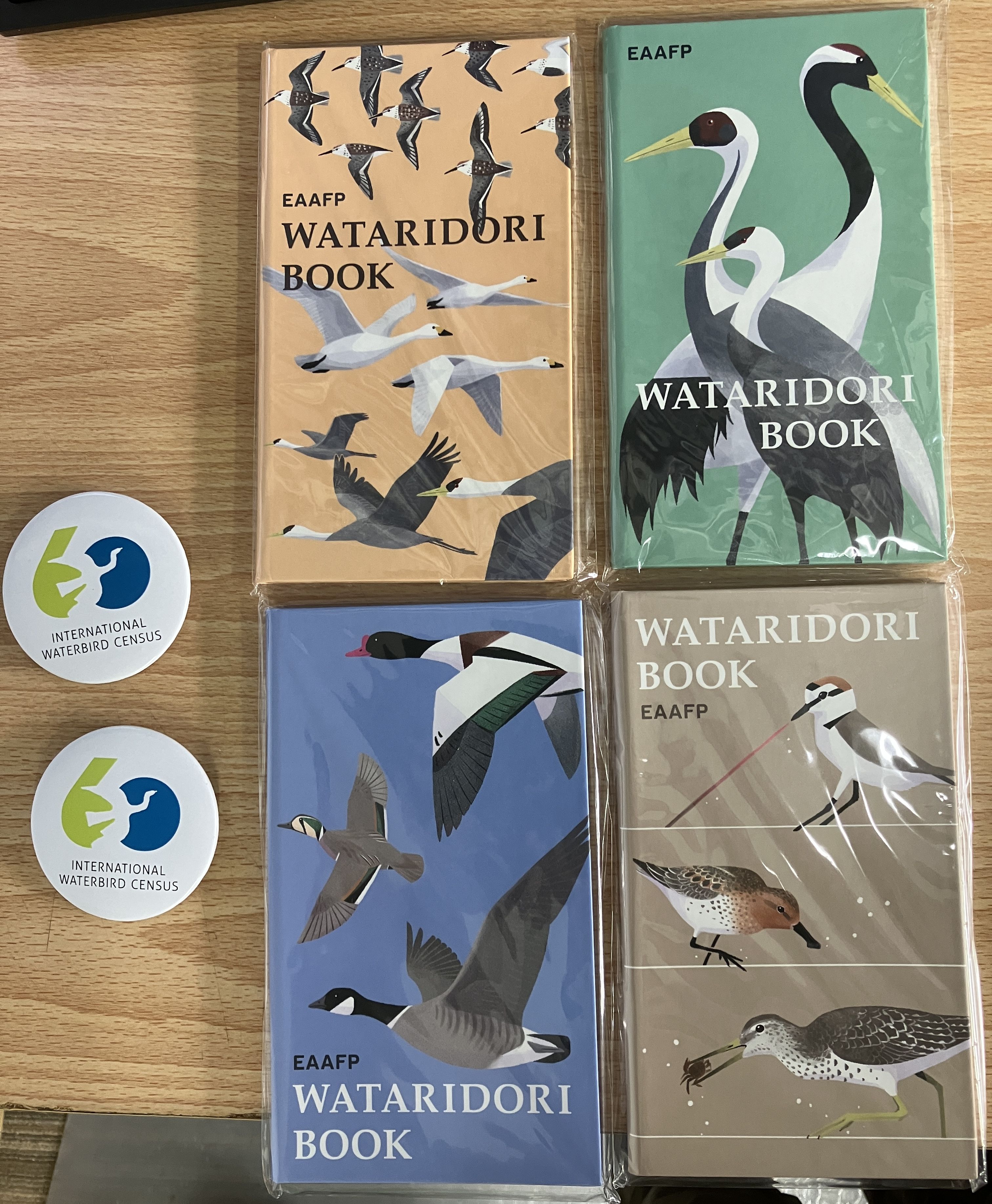 また、今回も2/9(月)までにデータ提供して頂いた参加者に、EAAF普及啓発の野帳を抽選で10名に(シギチ、ガンカモ、渡り性水鳥(各3冊)とツル(1冊)どれかが当たります)、くわえて60周年を迎えた"IWC(世界水鳥センサス)"のバッジを30名にプレゼントします。