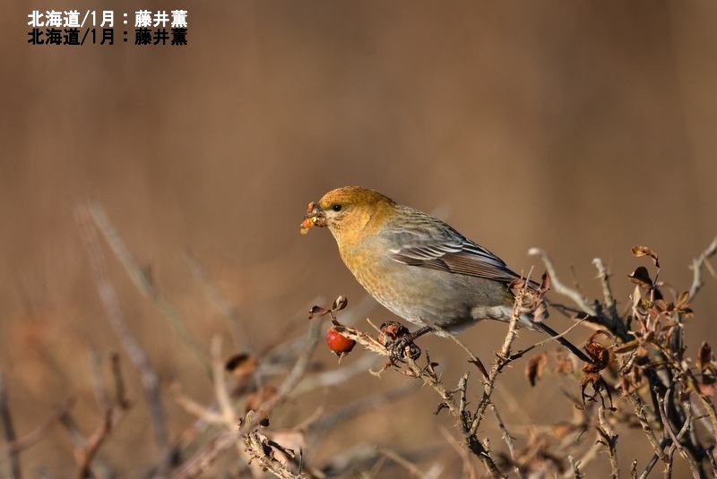 | 【今月のピックアップ】さて何という名前の鳥でしょう? 北海道高山のハイマツ帯で繁殖し、冬鳥として北海道の各地で観察することができる。ペンチのような嘴でハイマツの実をよく食べる ↓画像をクリック |