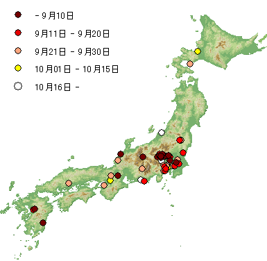 ヒバリやウグイスは九州など南西の方や太平洋側から飛来や初鳴きが始まっていて、ツバメもそれと共通しているところはあるのですが、日本海側の飛来が早い点なに特徴がありました。また,ツバメでは標高の高いところの方が飛来が遅い傾向も伺えます。